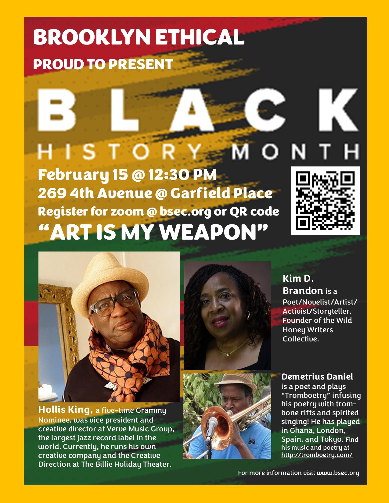 On Sunday Kim Brandon will host an interview with the amazing multi-talented artist and producer, Hollis King. Music will be provided by Tromboetry, Demetrius Daniel. Join us for this event on zoom or in person at Brooklyn Ethical.